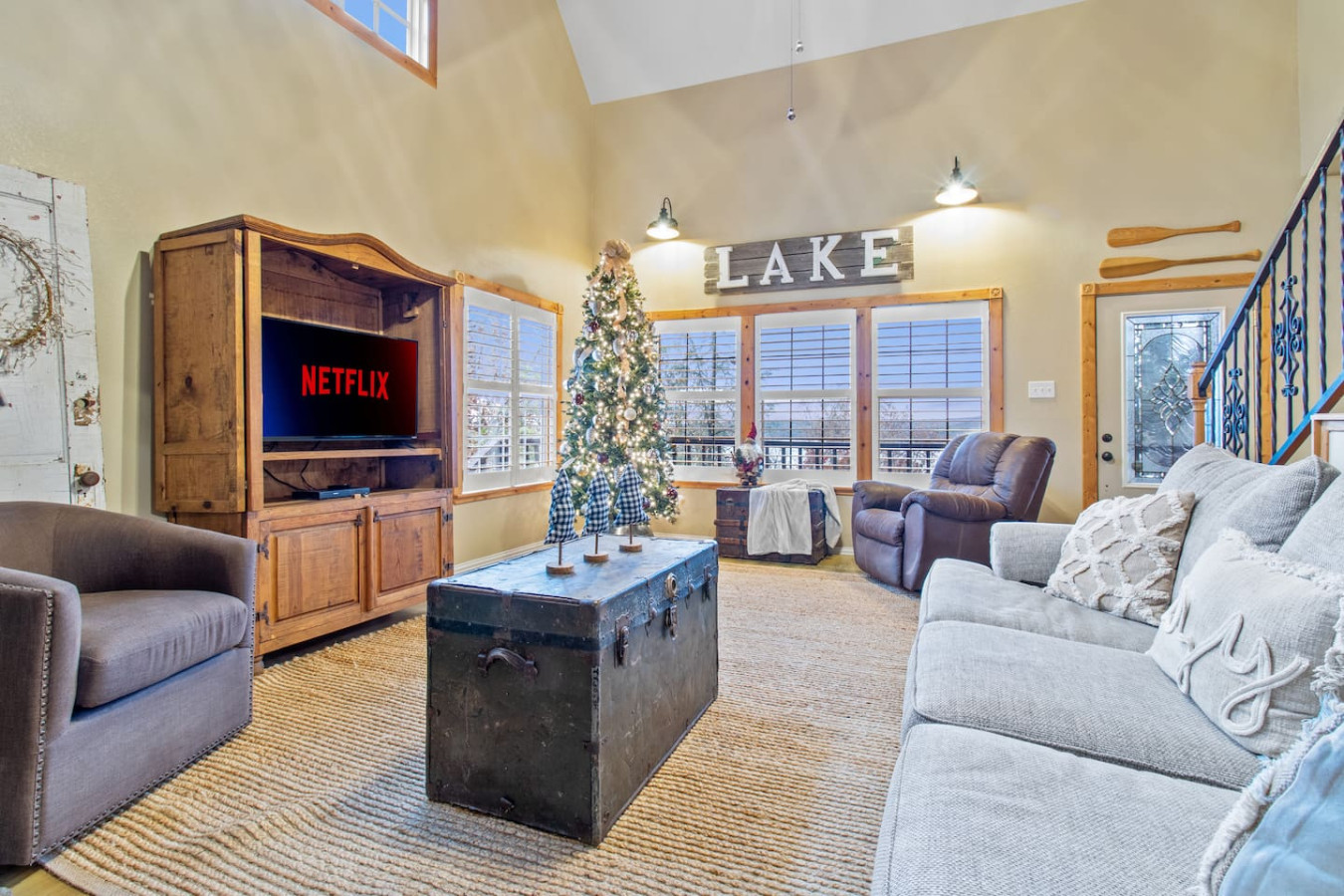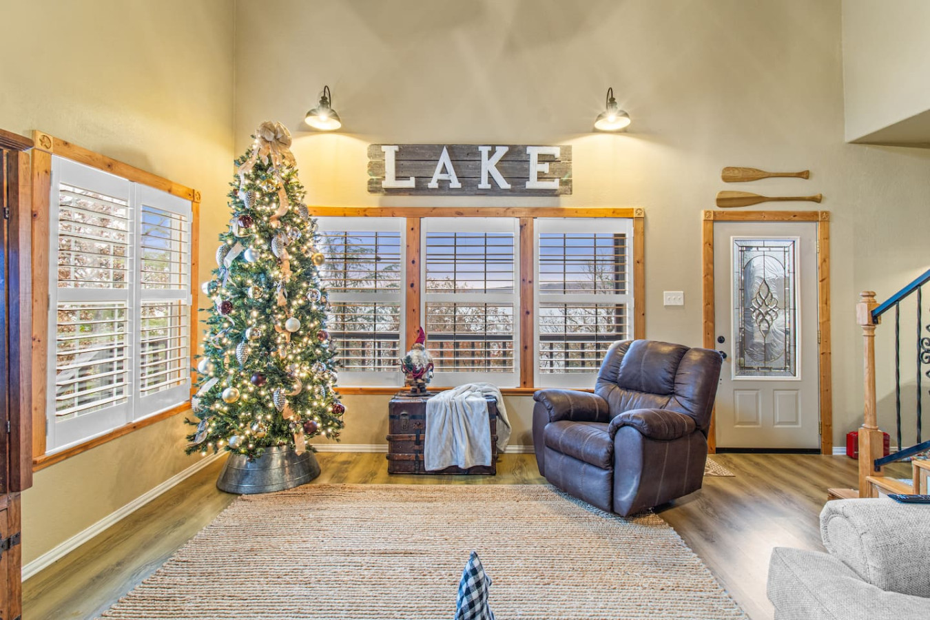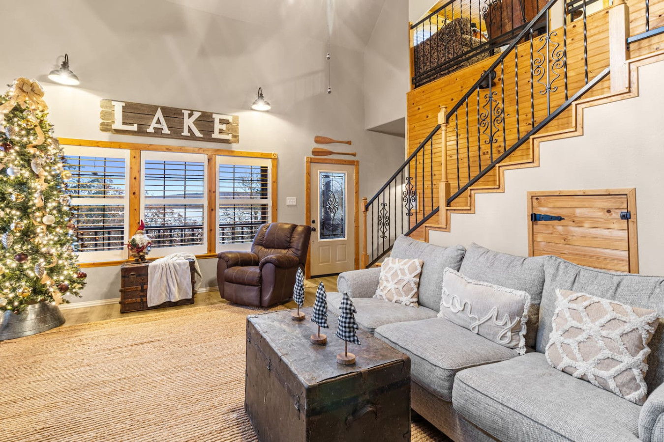 Spacious lakefront home with stunning views and beautifully maintained landscaping. Fully furnished for comfort, the lower level offers two queen beds and a full bed, ideal for families or groups. Upstairs, the loft features a primary suite with a king bed, ensuite with shower, smart TV, and a serene private balcony overlooking the lake—perfect for morning coffee, evening sunsets, or quiet relaxation. This spacious lakefront home offers comfort on every level. Please note there are multiple stairs to enter the property. The lower level features a cozy living room with ample seating and a smart TV, along with a fully stocked kitchen and dining area with seating for seven. An additional island provides seating for four more. Off the living room, guests can enjoy a large deck with a small dining table and extra seating—perfect for relaxing outdoors. The lower level also includes a convenient laundry area, a bedroom with two queen beds, a half bath, an electric fireplace, and a smart TV. A second bedroom offers a full-size bed, and there is an additional full bathroom with a shower. Upstairs, the open loft serves as the primary suite, featuring a king bed, smart TV, full bathroom with a shower, and a private balcony overlooking the lake. This peaceful spot is ideal for enjoying beautiful sunrises and quiet moments throughout your stay. Guests have full access to the entire home, with the exception of a locked cleaning closet used for supplies. This lovely home provides guests with convenient, comfortable self-check-in. We are just a phone call, text, or message away, always available to ensure that your stay is as enjoyable and stress-free as possible. Come and stay with us to experience comfortable accommodation, perfect for your short or long-term stay.