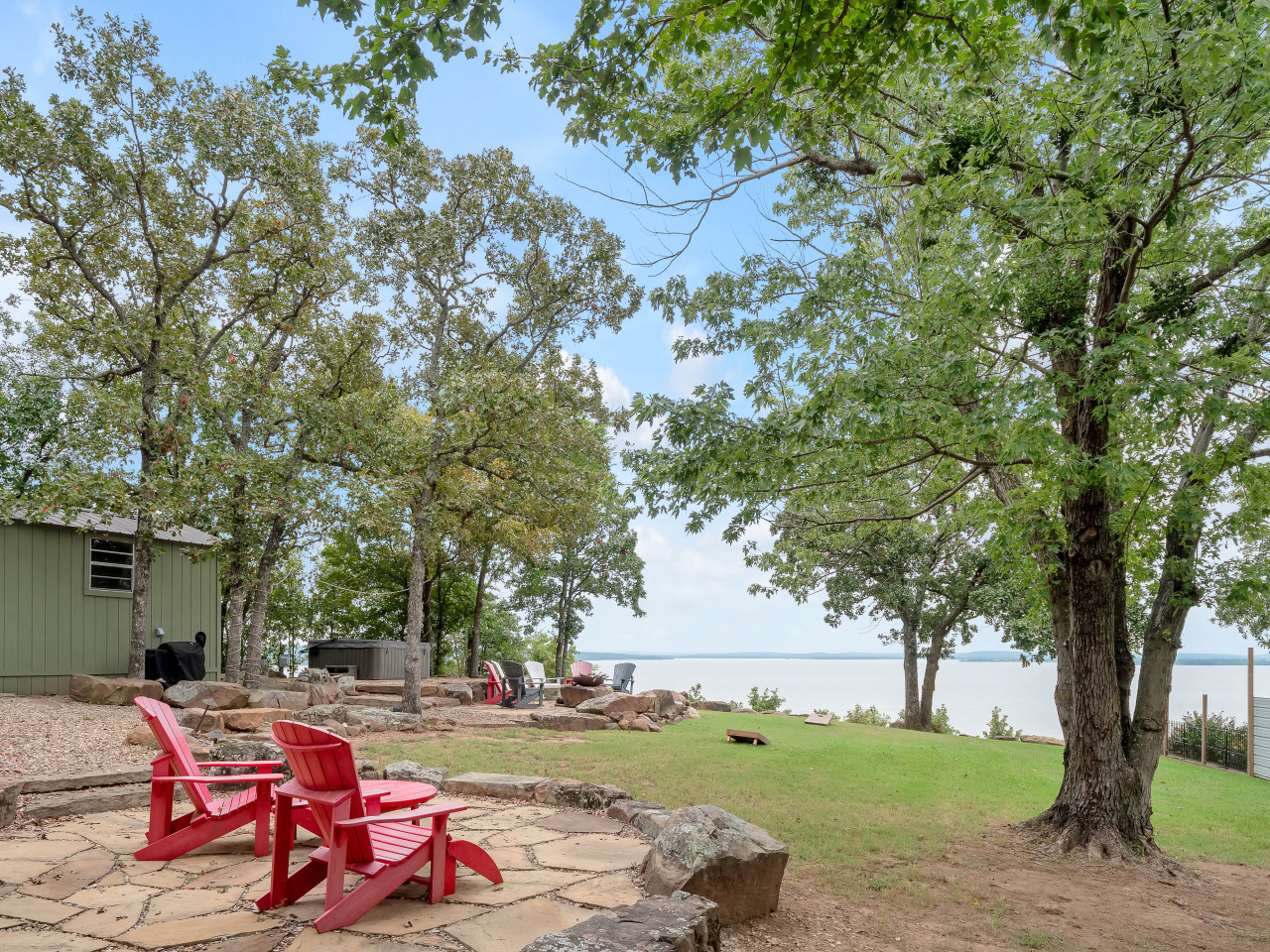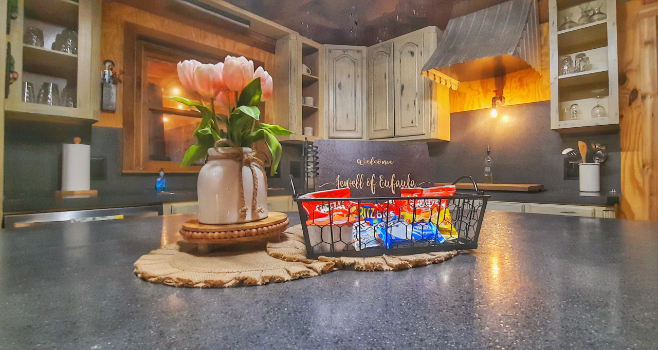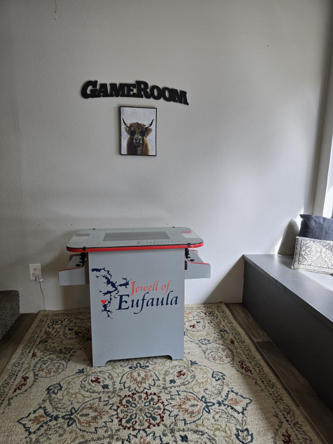 Welcome to The Jewell of Eufaula, a log cabin with a private view of lake Eufaula from the backyard. This is the perfect place to relax and unwind with family and friends. We are 1/2 mile from the nearest boat ramp. We have a pellet grill, lawn games, fire pit, ping pong table, and a jacuzzi hot tub! We also have WiFi, smart TV, card games, a pack n play, and everything else you need for a great stay! The exclusive backyard view is truly quite a JEWELL! Living room/kitchen- Open concept with seating area. The kitchen is well equipped with cookware, bakeware, utensils, full set of dishes, kids dishes, double oven, microwave, glass top stove, oil and basic spices for cooking. Lots of space to cook and a large island with 4 bar stools. Master bedroom- Queen size bed with rocking chair and 48” smart TV. Extra linens, ironing board, and pack n play are in the master closet. This bedroom is on the ground floor. Master bathroom- Double sink, double shower, and a large bathtub for a relaxing soak! Washer/dryer are in the master bathroom. Upstairs/loft- Very spacious open room with 3 cozy queen size beds. This room also has a full size bathroom with vanity sink and bathtub/ shower. Bonus room/game room- The bonus room is located just off of the living room. This room is where you get COZY!! With a twin to king convertible daybed, bunk beds, a couch that converts to a queen size bed, and an oversized couch this is a perfect room for ALL of the kids. There are huge bay windows with bench seats with a grand view of Lake Eufaula! There is also a table and chairs. This is a perfect place for card games or a workspace with a view. This room also has a smart TV and a retro 2 player arcade game. Highlights of the arcade game are donkey kong, pac-man, galaga, and frogger! Back porch- screened in back porch with seating for 10. Ping pong table and lawn games are on the back porch. There is also an adjacent uncovered porch with a seating area. Backyard- Jacuzzi hot tub as well as a beautifully landscaped and well lit backyard with 7 Adirondack chairs for enjoying the awesome lake views. There is also a Traeger pellet grill available. ** Cleaning and disinfectant supplies are provided. Cabin is fully available other than cleaning closet under the stairs which remains locked. There is also a storage shed in the backyard that remains locked. We will provide guests with self check-in instructions. We will be available via phone/text or messaging with in the app itself. The Jewell of Eufaula is located in Crowder, Oklahoma. Crowder is located just between Eufaula and McAlester. The cabin is just off Highway 69. The house is on a short street with just 4 other houses. Parking available for 8-9 vehicles. A truck and boat count as 2 vehicles. A truck and boat can be backed in in front of the garage door or on the east side of the house. We also have an EV car charger on the east end of the house.