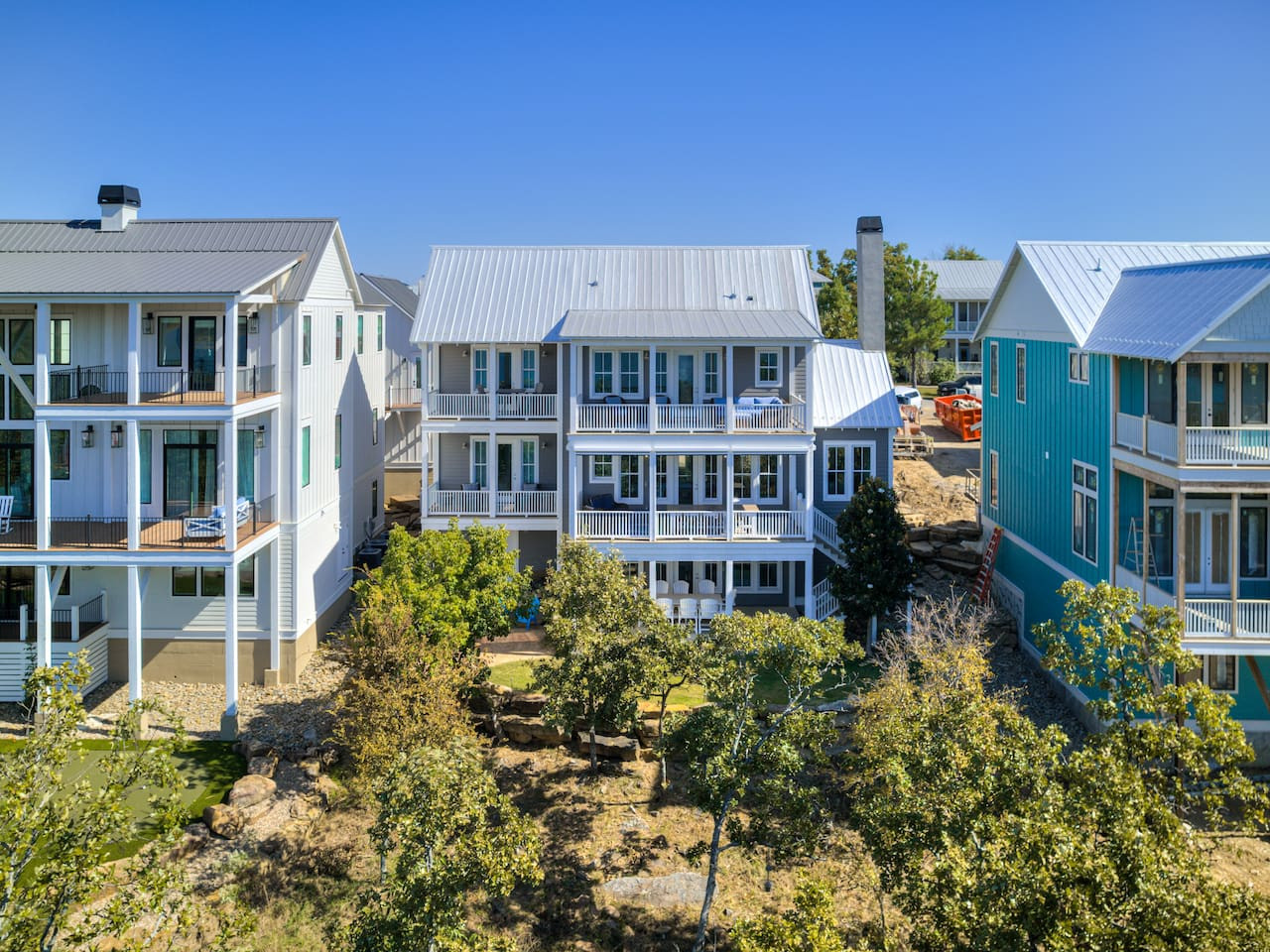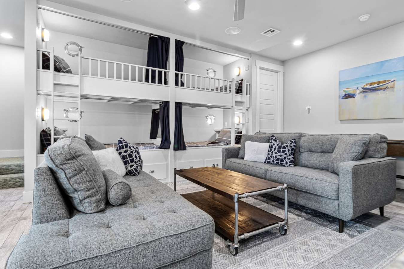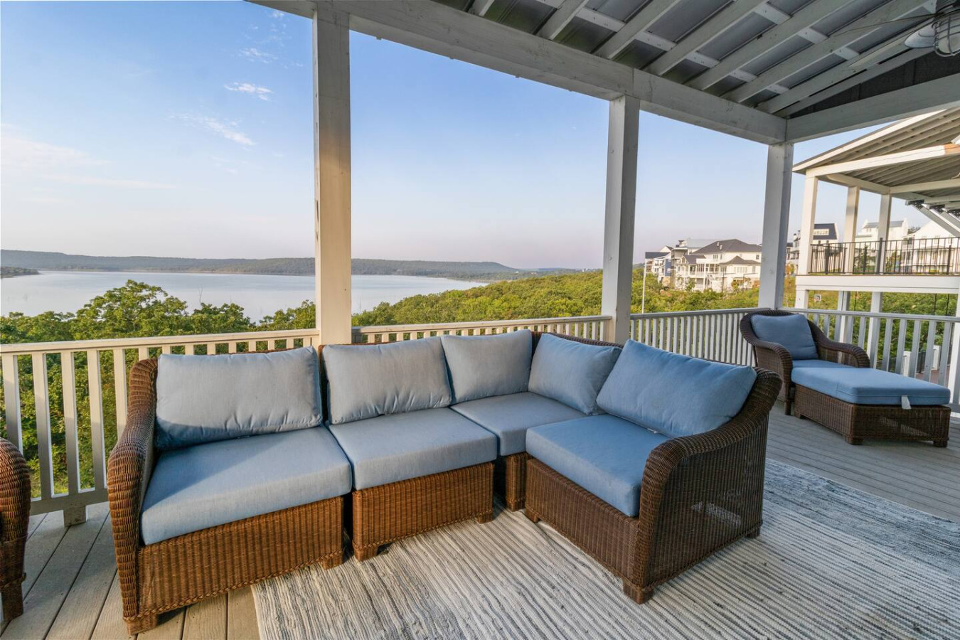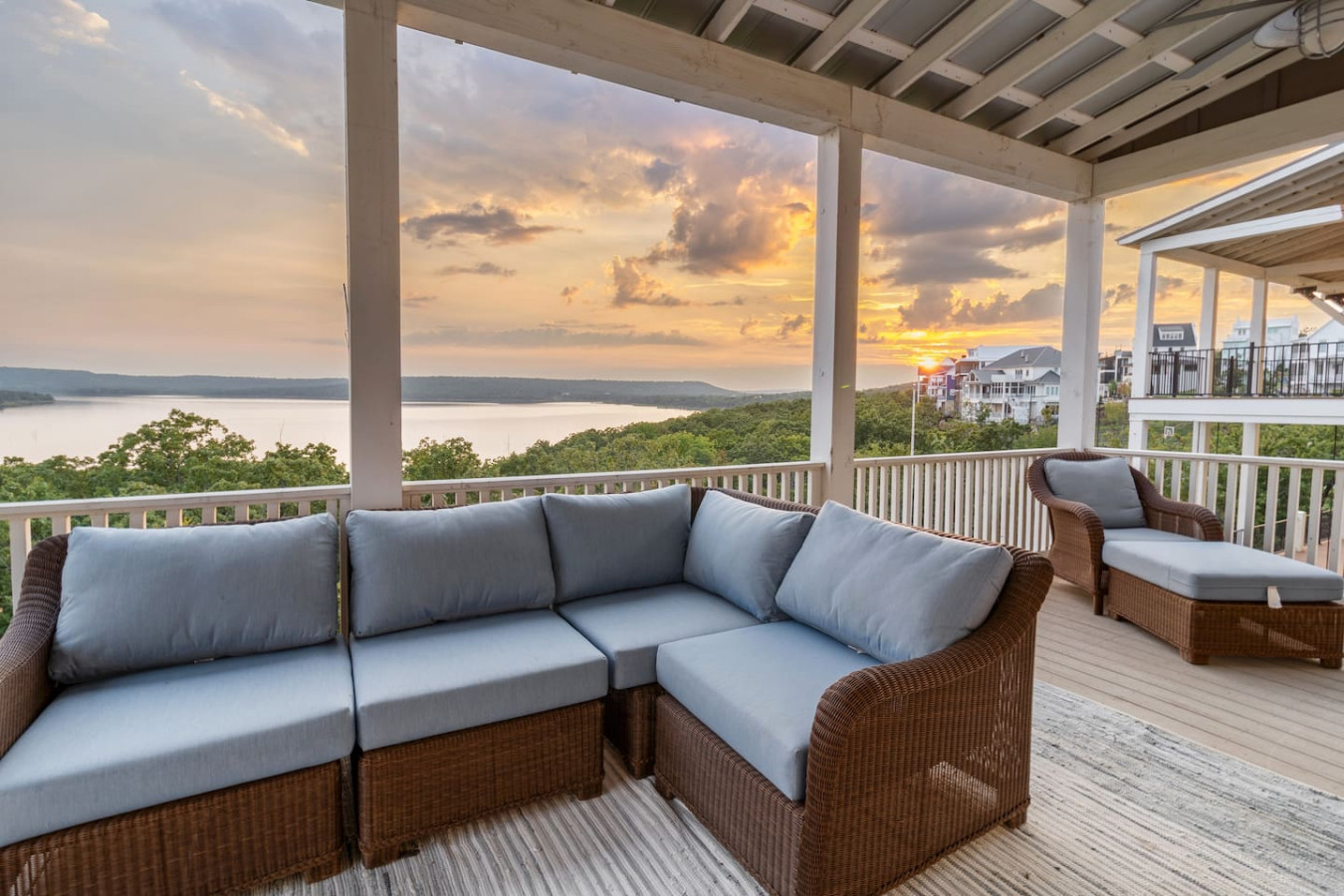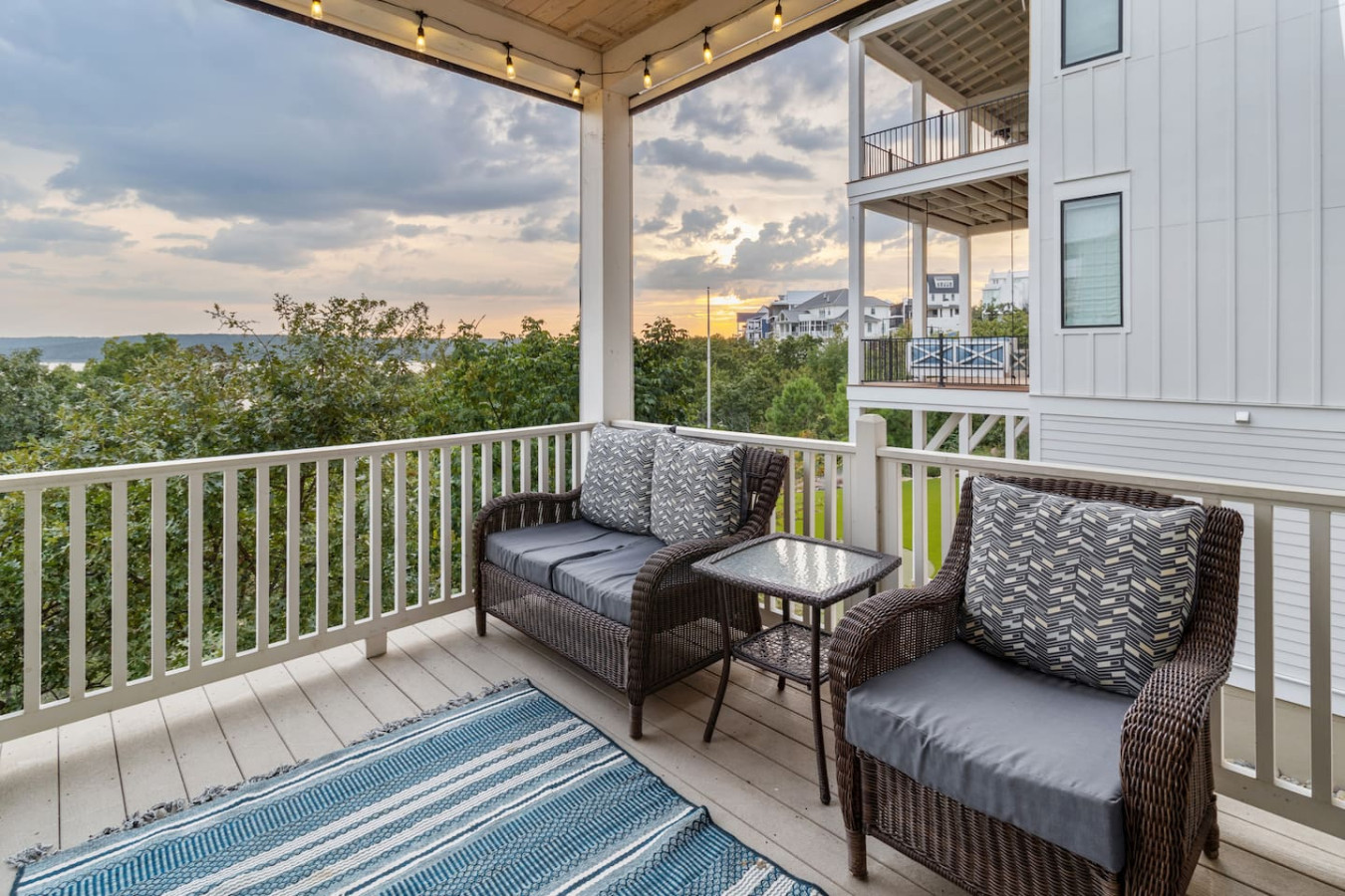 Spacious main house with 4 king bedrooms, including a master with a luxurious ensuite featuring double showers and a soaker tub. The basement is perfect for kids with 4 twin beds. Multiple decks offer stunning Lake Eufaula sunset views. The garage apartment sleeps 6 with a king bed, queen loft, pull-out couch, full kitchen, bath, and laundry. Located in walkable Carlton Landing with neighborhood amenities. Main Home Entry Level Open concept with a fully stocked kitchen (includes basic spices and oil), dining room with large table, and living room with Smart TV. Laundry room and half bath for convenience. King bedroom with private balcony and ensuite bath with shower only. Large balcony off the kitchen/dining/living area features a big table for gathering and enjoying evening meals with lake views. Lower Level Perfect for kids or extra guests with 4 twin bunk beds, Smart TV, shuffleboard game, and kitchenette with fridge, sink, microwave, and toaster oven. Walk out to a covered patio overlooking the lake with access to the pellet grill and firepit for evening fun. Upper Level Three king bedrooms, including the luxurious primary suite with Smart TV, spa bath with soaking tub and double showers, and a private balcony with panoramic lake views. The two additional bedrooms share a Jack-and-Jill bathroom with tub and shower, and one includes its own private balcony. Garage Apartment- Sleeps 6 with a king bedroom, queen loft, queen pull-out sofa, full kitchen, bathroom, and washer/dryer. Note: the apartment requires a flight of stairs to access, and the queen loft has steep stairs. Smaller children and elderly guests should use with caution.