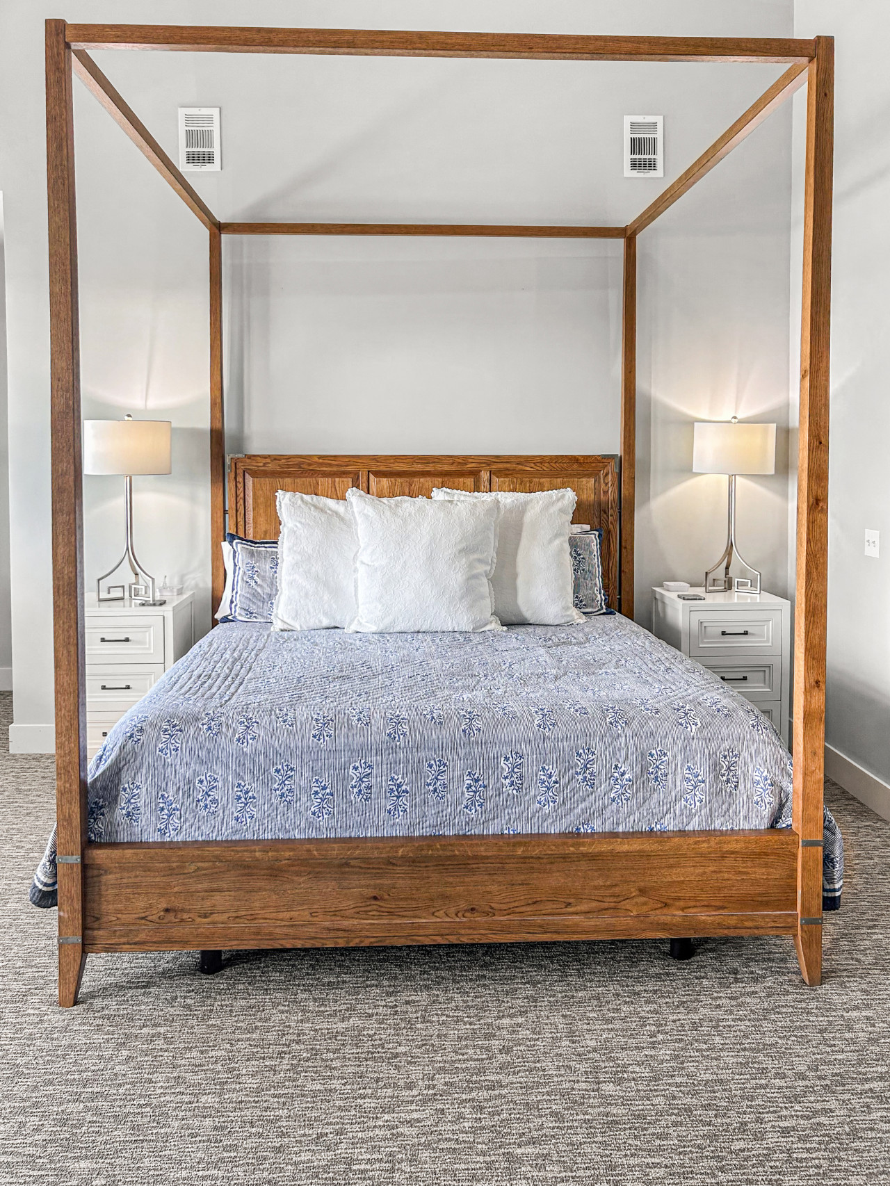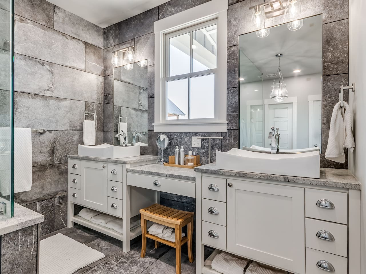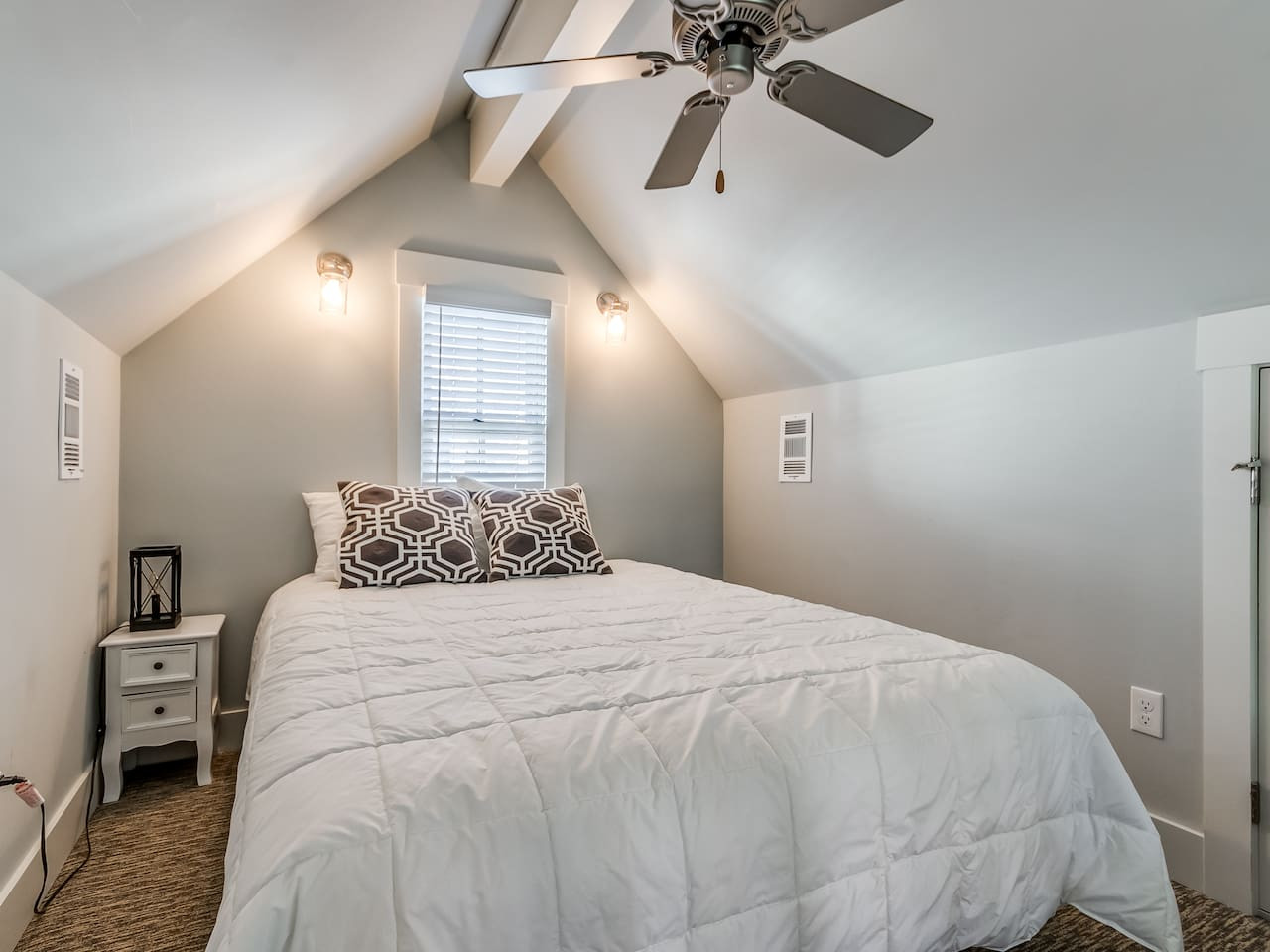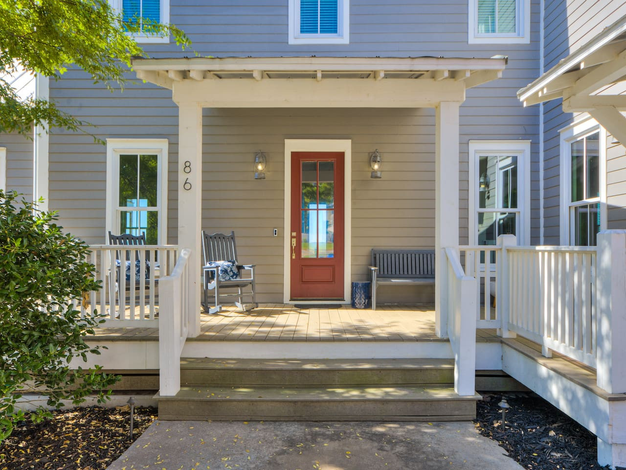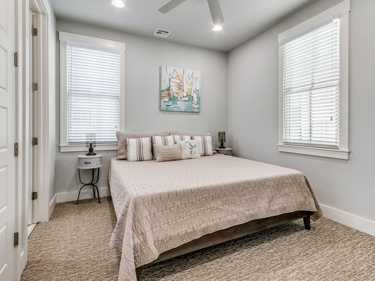 Spacious main house with 4 king bedrooms, including a master with a luxurious ensuite featuring double showers and a soaker tub. The basement is perfect for kids with 4 twin beds. Multiple decks offer stunning Lake Eufaula sunset views. The garage apartment sleeps 6 with a king bed, queen loft, pull-out couch, full kitchen, bath, and laundry. Located in walkable Carlton Landing with neighborhood amenities. Main Home Entry Level Open concept with a fully stocked kitchen (includes basic spices and oil), dining room with large table, and living room with Smart TV. Laundry room and half bath for convenience. King bedroom with private balcony and ensuite bath with shower only. Large balcony off the kitchen/dining/living area features a big table for gathering and enjoying evening meals with lake views. Lower Level Perfect for kids or extra guests with 4 twin bunk beds, Smart TV, shuffleboard game, and kitchenette with fridge, sink, microwave, and toaster oven. Walk out to a covered patio overlooking the lake with access to the pellet grill and firepit for evening fun. Upper Level Three king bedrooms, including the luxurious primary suite with Smart TV, spa bath with soaking tub and double showers, and a private balcony with panoramic lake views. The two additional bedrooms share a Jack-and-Jill bathroom with tub and shower, and one includes its own private balcony. Garage Apartment- Sleeps 6 with a king bedroom, queen loft, queen pull-out sofa, full kitchen, bathroom, and washer/dryer. Note: the apartment requires a flight of stairs to access, and the queen loft has steep stairs. Smaller children and elderly guests should use with caution.